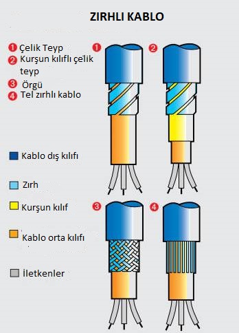 Kablolarda yer alan zırh, örgü ve kurşun kılıflar resimlerde belirlenmiştir. Yandaki 3 numaralı resimde çapraz örgü mevcuttur, kabloların dış elektromagnetik alandan etkilenmesini önlemek içindir. 4 numaralı resimde ise çelik zırh görülmektedir . Bu teller yukarıda bahsedilen çelikten imal edilmiş olan ve gerek yeraltı maden ocaklarının ağır çalışma şartlarına dayanıklılık için gerekli olan mekanik mukavemete ve topraklama gereklerinin sağlanması içindir
